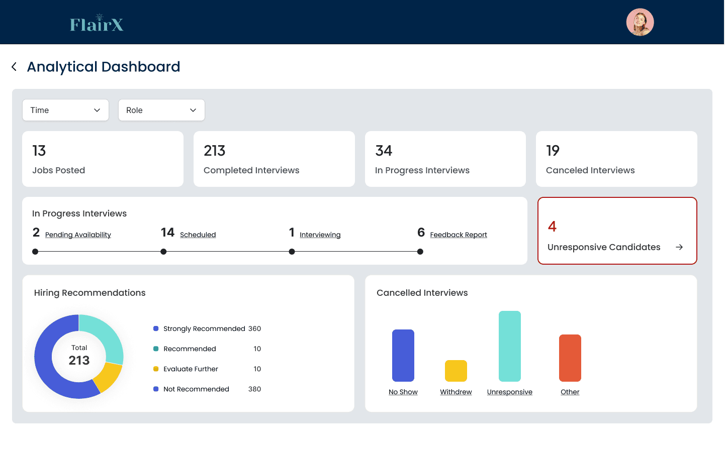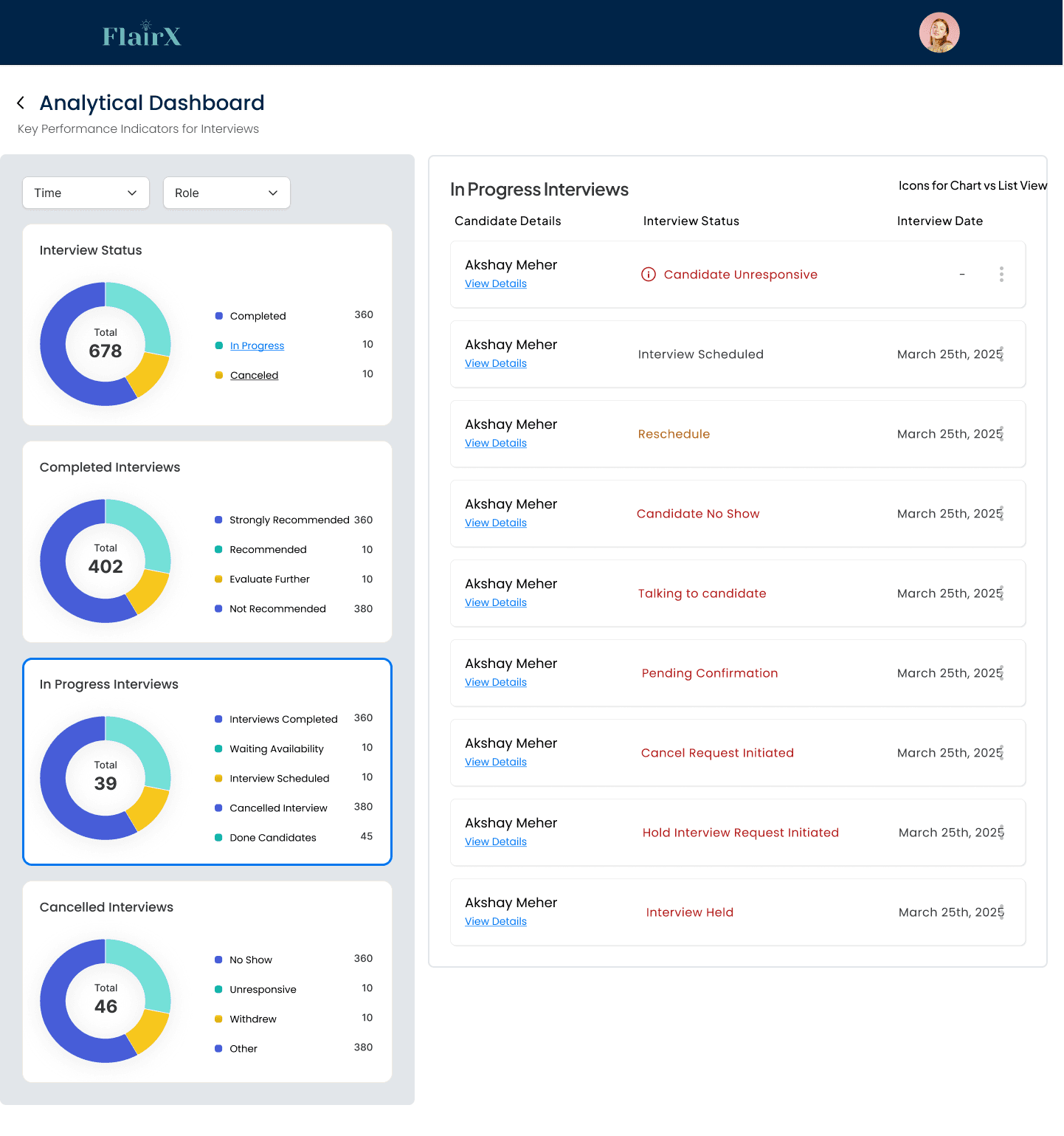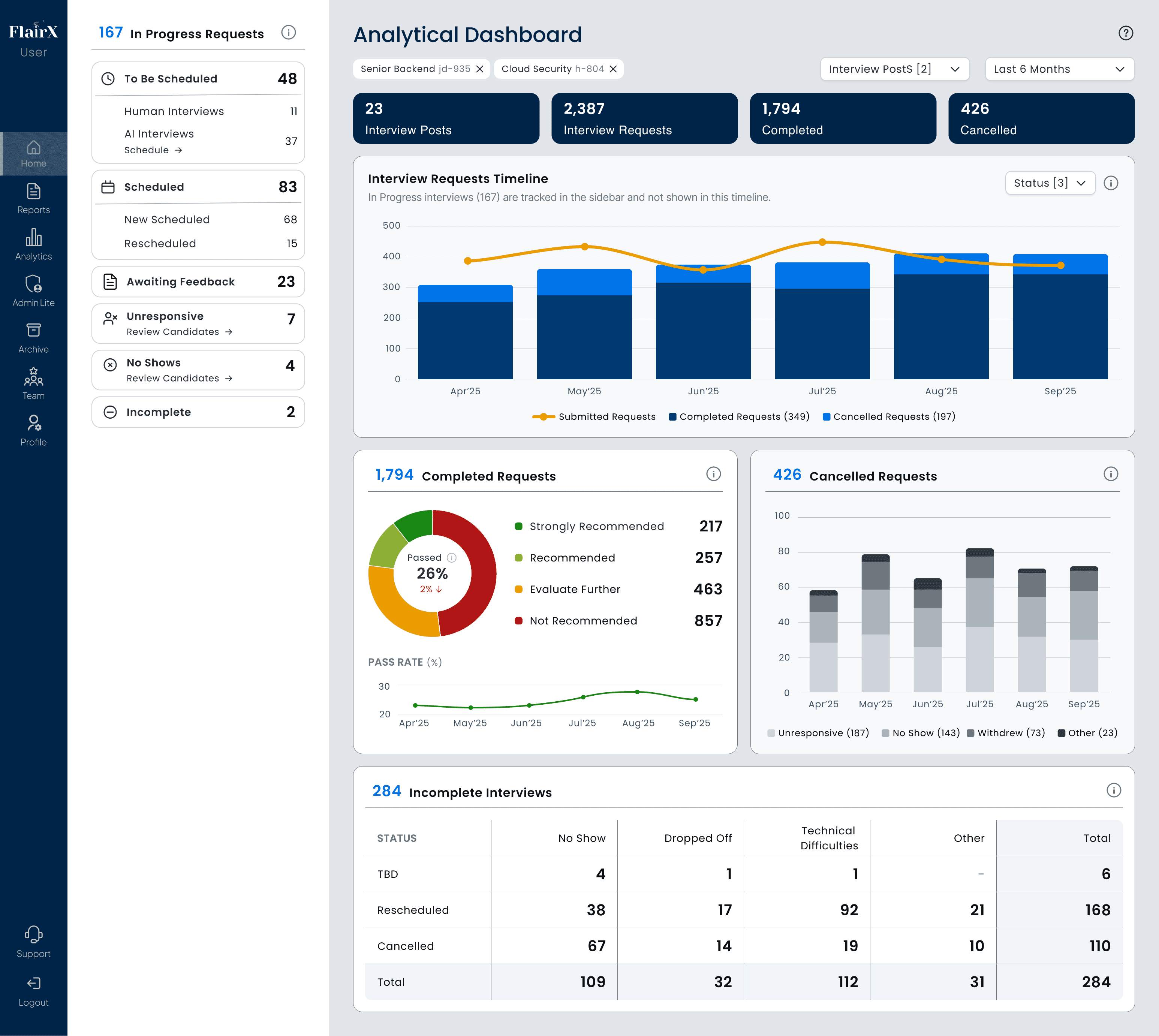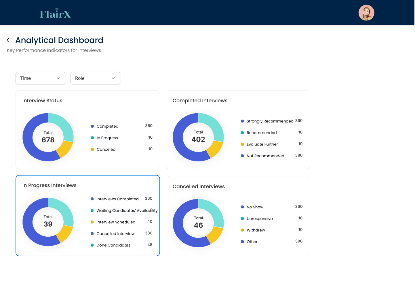 An analytical dashboard to deliver real-time, in-depth interview progress insight to customers.