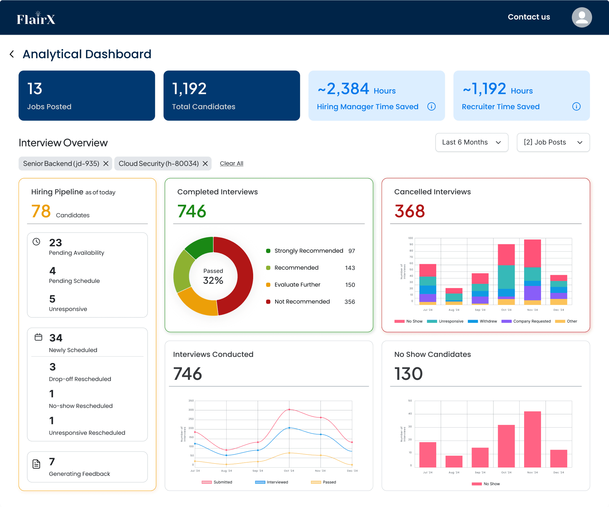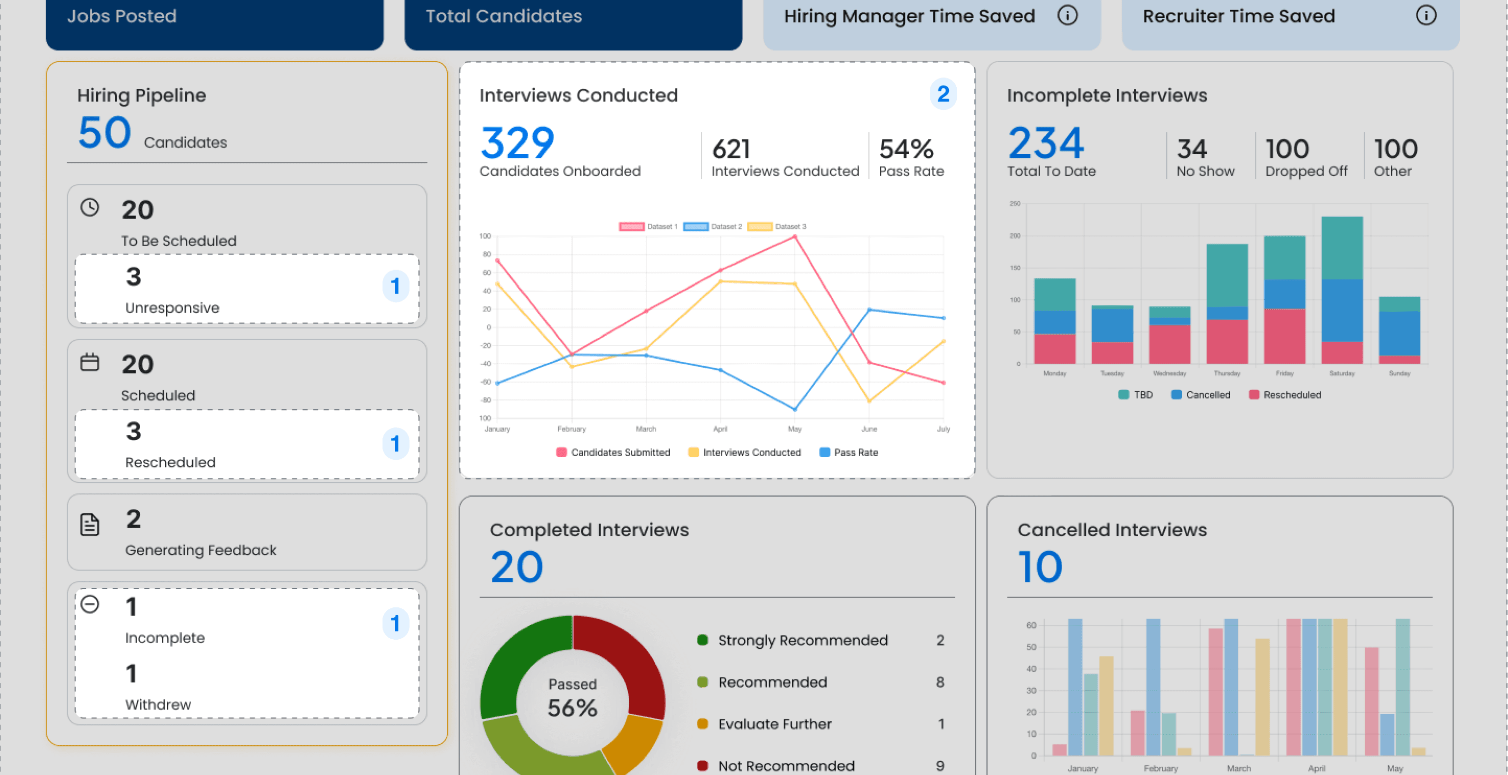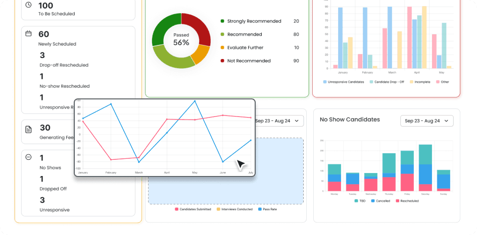 Showed candidates sent, interviewed, and pass rate over time in a single view.