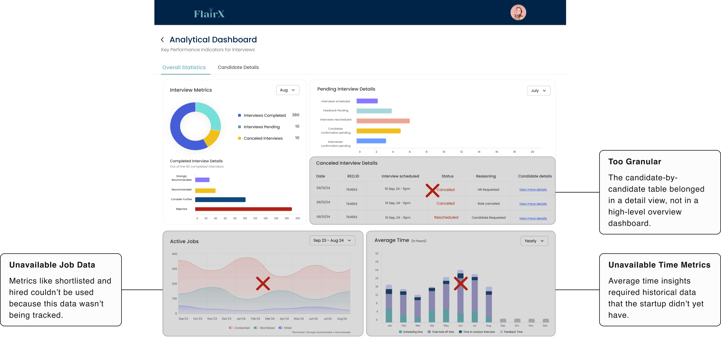 I researched dashboard UX patterns and studied HR/CRM dashboards, but early iterations kept missing the mark. Generic dashboard patterns didn't match our interview-as-a-service use case.